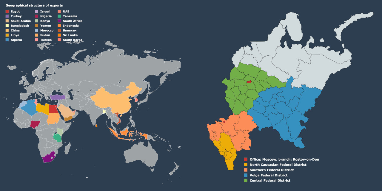The company buys agricultural products mainly from agricultural producers throughout the Russian Federation and exports to various countries around the world using its own logistics infrastructure in Rostov-on-Don and at the Port Kavkaz.